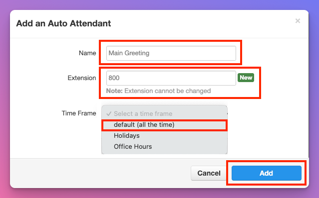 Even if you are creating a greeting for a specific date or time, always use Default Time Frames when creating auto-attendants. Timeframes are set at the telephone number level.7. Now that your auto-attendant is created, you're going to want to create the voice that customers hear when they call into your business.