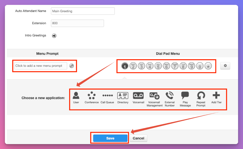 Now that you have create your auto-attendant, we recommend testing it by calling the extension you used, for example 800 on your B1 Communications phone. You'll be able to hear your greeting, press all the options and test all the functionality.