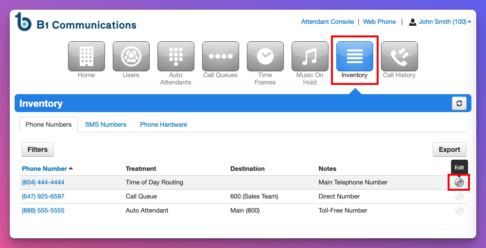 2. Select the edit icon of the phone number you wish to use the auto-attendant on.