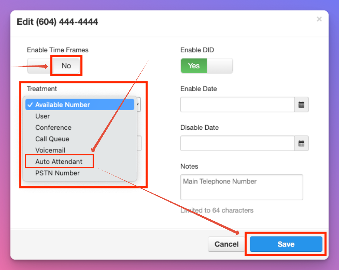4. For Treatment which where callers are sent. Select 'Auto-Attendant'